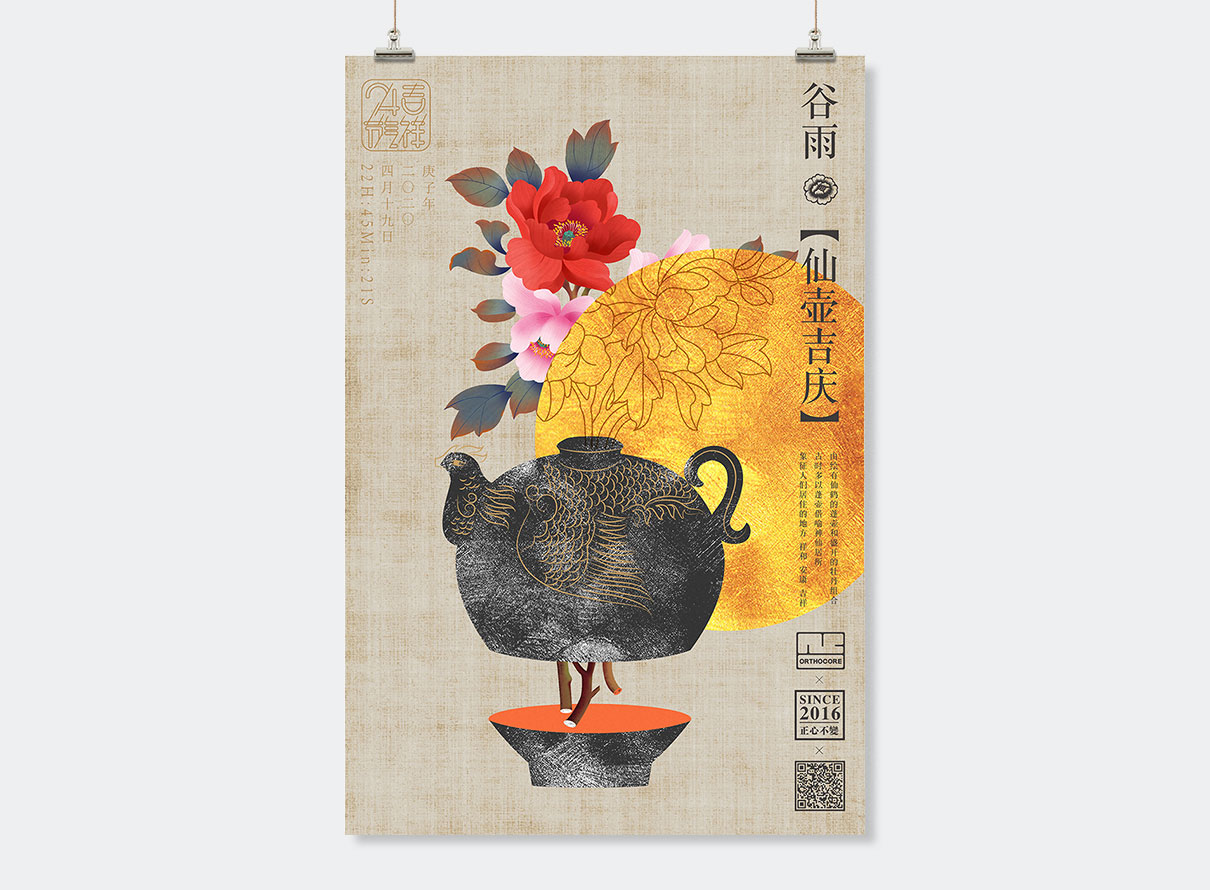 吉祥二十四节气系列从节气入手,结合「以一花之风信应之」的概念,运用花信风加入吉祥祝福的形式,深入且全面的展示节气对应之花与祝福,同时兼顾一些时事,将整个系列更好地贴合时间和空间的主轴。是一份花信风的时尚,将花语的脉脉含情融入其中;是一个节气的祝福,用花与吉祥更清楚地记录节气,传承传统。