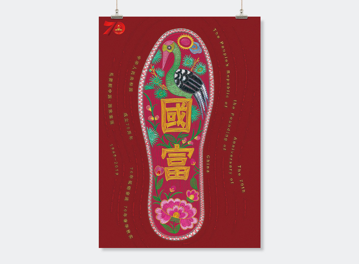 设计以绣花鞋垫为主要体现元素进行设计,继承沂蒙六姐妹的红嫂精神,一针一线浸染着军民鱼水情、党群一家亲的关系。国富,是共和国如青松和白鹤般青翠长久,如牡丹般富贵,如太阳般光耀;民兴,是燕子带来春之信息,是柳留下党和人民的鱼水情,是荷携着的家和万事兴。70年走来,是对党深深信任;70年不变,是对共和国由衷的祝福。