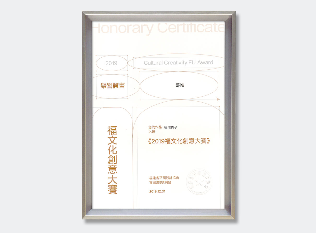 由福建省文化和旅游厅、福建省平面设计协会、福建省海峡文旅创意产业协会、古田路9号网站、福建民俗博物馆联合出品《福见》福文化主题台历,历时2个多月,联合全球华人设计师,通过多种艺术形式创新解读“福”字,内页广泛囊括了海报、插画、书法、摄影、装置、文创周边等多种形式的当代“福”文化。收到来自全球各地2000多件作品投递,最终入选365位设计师的优秀作品,用365个满满福气,查阅新一年的点点滴滴。岳阳正心文化创意有限公司邓帷首席设计师插画作品「福增贵子」入选《2019福文化创意大赛》。