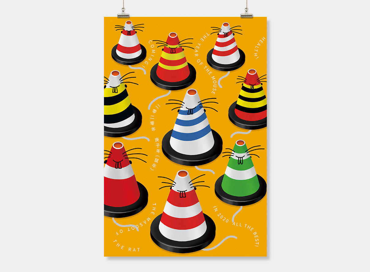 庚子年,灵鼠动。安全鼠作品通过一个个安全锥进行呈现。每一个都是不同的警示内容,每一个都有相同的趣味呈现。融合了打地鼠的概念,有一种闯关玩乐的童趣。整个作品,趣味中传递着安全的概念,时尚中传承着传统。